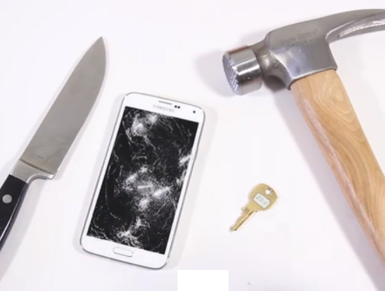 Trong khi dao và chìa khóa hầu như không gây hại gì cho Galaxy S5, đặc biệt là màn hình của máy. Galaxy S5 cũng vẫn hoạt động được sau vài cú đập nhẹ bằng búa. Tuy nhiên, những cú đập mạnh hơn, đặc biệt những cú đập bằng đầu nhọn của búa, đã khiến Galaxy S5 phải hoàn toàn đầu hàng. Máy không còn hoạt động và màn hình bị nứt vỡ.