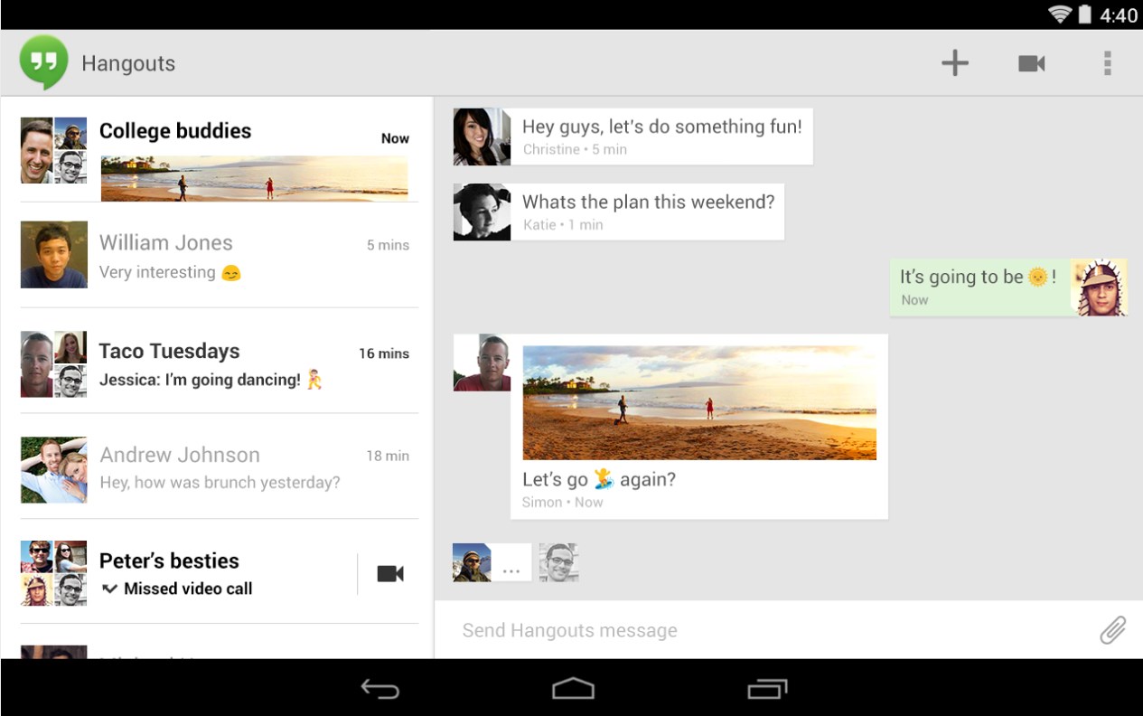 Hangouts không phải ứng dụng chat tốt nhất, cũng không phải ứng dụng nhắn tin tốt nhất, nhưng nó kết hợp hai tính năng này. Hangouts cho phép gọi video, chat theo nhóm, chia sẻ nội dung đa phương tiện. Ứng dụng hỗ trợ đồng bộ hóa giữa các thiết bị.