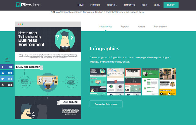 Infographic cũng là một phương pháp tuyệt vời trong content marketing, và điều cản trở các marketer nhiều nhất từ trước đến nay chính là thiếu người có khả năng thiết kế. Vấn đề đó nay không còn nữa với Piktochart . Kho infographic mẫu của Piktochart có rất nhiều infographic các loại cho bạn lựa chọn, từ loại về tiểu sử cuộc đời cho đến loại về hướng dẫn hay nêu thống kê cho người xem được trình bày một cách hết sức sáng tạo. Bạn chỉ cần kéo thả thêm các yếu tố mình cần rồi save ảnh về máy là xong.