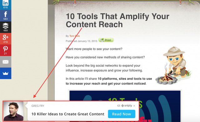 Một trong những thủ thuật growth hacking hiệu quả là share lại các post từ những chuyên gia nổi tiếng trong ngành để xây dựng sự tin tưởng cho người dùng, Thế nhưng những nội dung bạn share lại thường nằm ở các website khác mà bạn không có quyền kiểm soát nên thường người đọc sẽ “ngó lơ” luôn website/page của bạn khi được dẫn sang nguồn khác. Hiểu điều này, Sniply cho phép bạn gắn nút kêu gọi hành động (Call to action) vào bất cứ nội dung gì bạn chia sẻ. Nó giúp bạn gắn một nút quay lại/kêu gọi hành động vào một hộp thoại bên góc trái màn hình để người đọc có thể quay trở lại website của bạn.