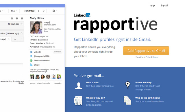 Sẽ thế nào nếu bạn nhận được email từ một khách hàng tiềm năng và muốn biết thêm thông tin chi tiết của họ? Rapportive sẽ giúp bạn dựa vào email để tra ra ngay ảnh chân dung, nơi sống, nghề nghiệp, công ty, hồ sơ cá nhân trên LinkedIn,…và hiển thị tất cả ngay trên giao diện Gmail, rất tuyệt phải không?