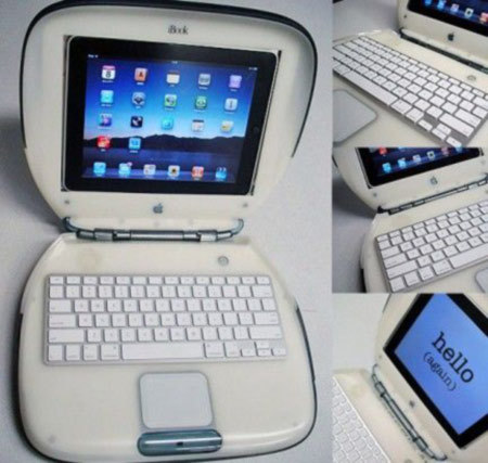 Nếu bạn yêu thích “Táo”, hãy thể hiện của mình bằng cách biến chiếc iPad của mình thành 1 chiếc iBookPad không giống ai. Kiếm một chiếc iBook cũ, Camera Connection Kit, cáp nối iPod Dock Extender, và một bàn phím USB. Hãy xem hình ảnh, rất ấn tượng, nhưng bạn không nên gập màn hình xuống như iBook để tránh hư hỏng màn hình iPad.
