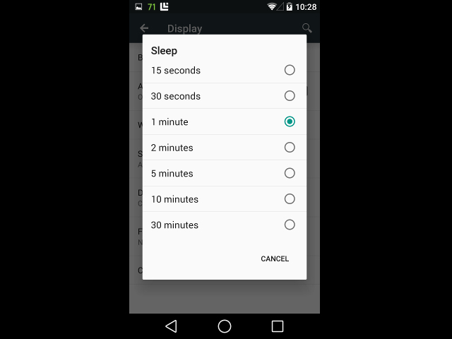 Thời gian màn hình tắt tuy chỉ là một chi tiết nhỏ nhưng cũng đáng lưu tâm. Nếu bạn đặt thời gian để màn hình ‘sleep” từ 1 đến 5 phút mà không có thói quen khóa điện thoại, màn hình sẽ làm hao pin vô ích. Thời gian tối ưu la khoảng 30 giây và bạn nên hình thành thói quen bấm nút nguồn để khóa máy khi không dùng.
