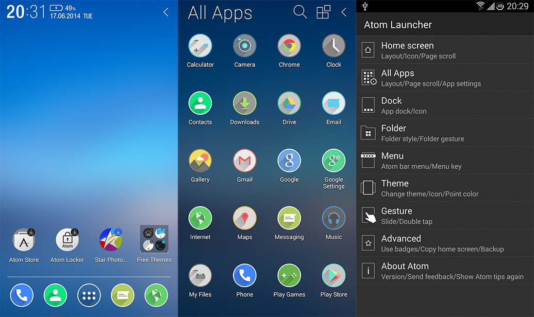 Atom cũng là một launcher có nhiều tính năng tùy biến, trong đó thú vị hơn cả là trình tạo theme. Người dùng có thể tự thiết kế theme và chia sẻ với người khác. Launcher hoạt động rất mượt mà.