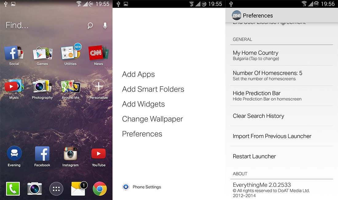EverythingMe Launcher là một launcher hoạt động theo ngữ cảnh, được quảng cáo là có thể “dự đoán” ứng dụng người dùng muốn sử dụng ở một thời điểm nào đó. Theo thời gian trong ngày, launcher này sẽ gợi ý những ứng dụng bạn có thể muốn dùng nhất. Ví dụ, EverythingMe Launcher sẽ gợi ý bạn dùng các ứng dụng đọc tin tức vào buổi sáng, ứng dụng làm việc vào ban ngày và thậm chí gợi ý địa chỉ các nhà hàng nếu nó phát hiện bạn đi ra ngoài vào buổi tối. Tuy nhiên, EverythingMe Launcher không có nhiều lựa chọn tùy chỉnh.