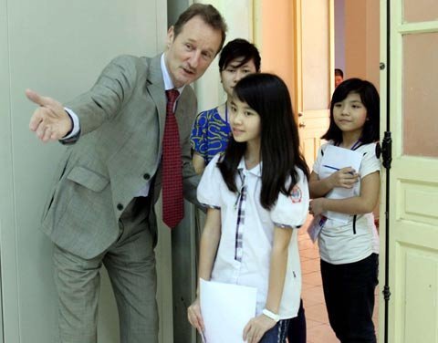 | Ông Malcolm Young, Giám đốc học vụ cấp cao Language Link hướng dẫn các thí sinh vào phòng thi phỏng vấn |