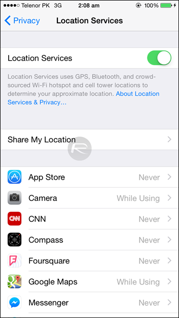 Nhiều ứng dụng đề nghị truy cập dữ liệu địa điểm của thiết bị, gây lo ngại cả về quyền riêng tư lẫn thời lượng pin. Truy cập Settings > Privacy > Location Services để thiết lập quyền cho từng dịch vụ.