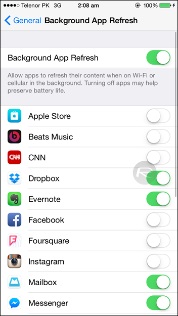 Không phải ứng dụng nào cũng cần cập nhật mọi giây mọi phút, vì thế bạn nên tùy chỉnh xem cái nào cần cái nào không. Truy cập vào Settings > General > Background App Refresh để lựa chọn.