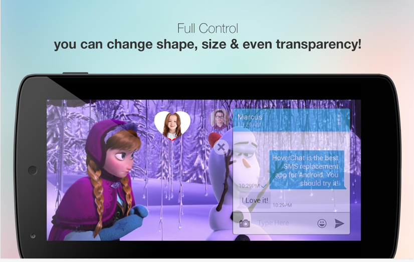 HoverChat là một ứng dụng nhắn tin, cho phép bạn tiến hành mặc dù vẫn đang tiếp tục cuộc thoại, thậm chí khi đang sử dụng một ứng dụng khác hoặc đang xem phim. Bạn có thể thay đổi kích thước và độ thoáng của cửa sổ tin nhắn theo ý muốn.