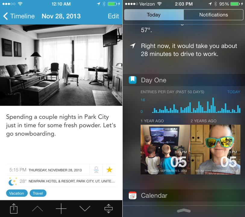 Day One (4,99 USD) là ứng dụng nhật ký hiện đại, cho phép bạn ghi lại những sự việc trải qua trong ngày một cách đơn giản và tinh tế hơn. Bạn có thể xem lại những bài viết cũ thông qua trung tâm thông báo của iPhone 6. Tiện ích của Day One giúp bạn lưu và gửi ảnh, đường liên kết mà không cần mở ứng dụng.