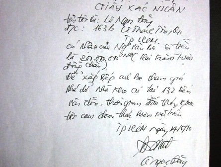 dỡ và san lấp mặt bằng) gửi đơn đến phòng CSĐT tội phạm về TTXH (PC45) tố cáo