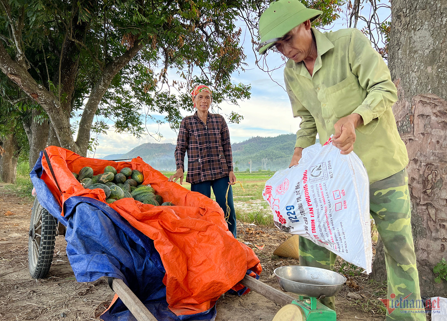 Ông Nguyễn Văn Tiến (SN 1962, chồng bà Vân) vừa chở xe dưa từ dưới ruộng lên cho vợ bán, chia sẻ: “Dưa đẹp bán cho thương lái trung bình chỉ được 5.500 đồng/kg, bán lẻ 7.000- 8.000 đồng/kg. Gia đình trồng 5 sào dưa cho thu nhập khoảng 30 triệu đồng”.