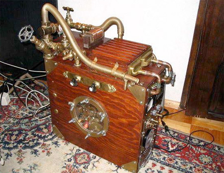 | Thùng đựng máy tính theo phong cách máy động cơ hơi nước. |