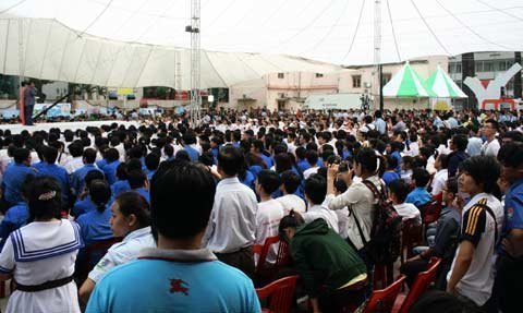 Ca sĩ Đàm Vĩnh Hưng ngay khi vừa bước chân đến tham dự chương trình đã bị hàng trăm bạn trẻ vây kín để chụp hình lưu niệm.