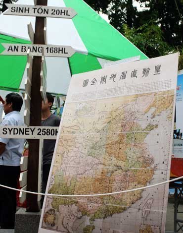 Bên lề ngày hội Mùa xuân biển đảo 2012, ban tổ chức còn trưng bày triển lãm "Tuổi trẻ và biển đảo" với nhiều hình ảnh về bản đồ, cột mốc chủ quyền Việt Nam và những hiện vật "sống" như cây bàng vuông, các phiến đá chủ quyền... Trong ảnh là bản đồ cổ khẳng định Trung Quốc không có Hoàng Sa và Trường Sa.
