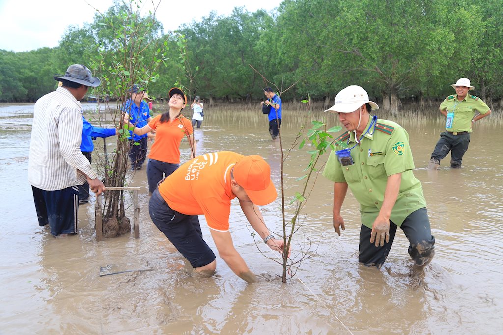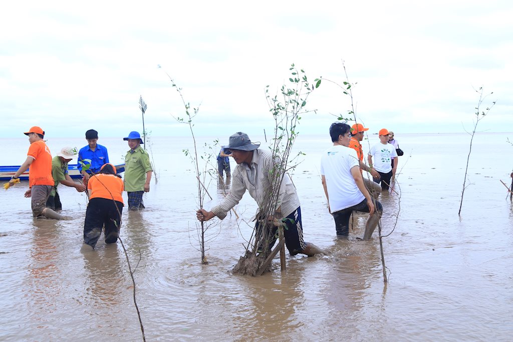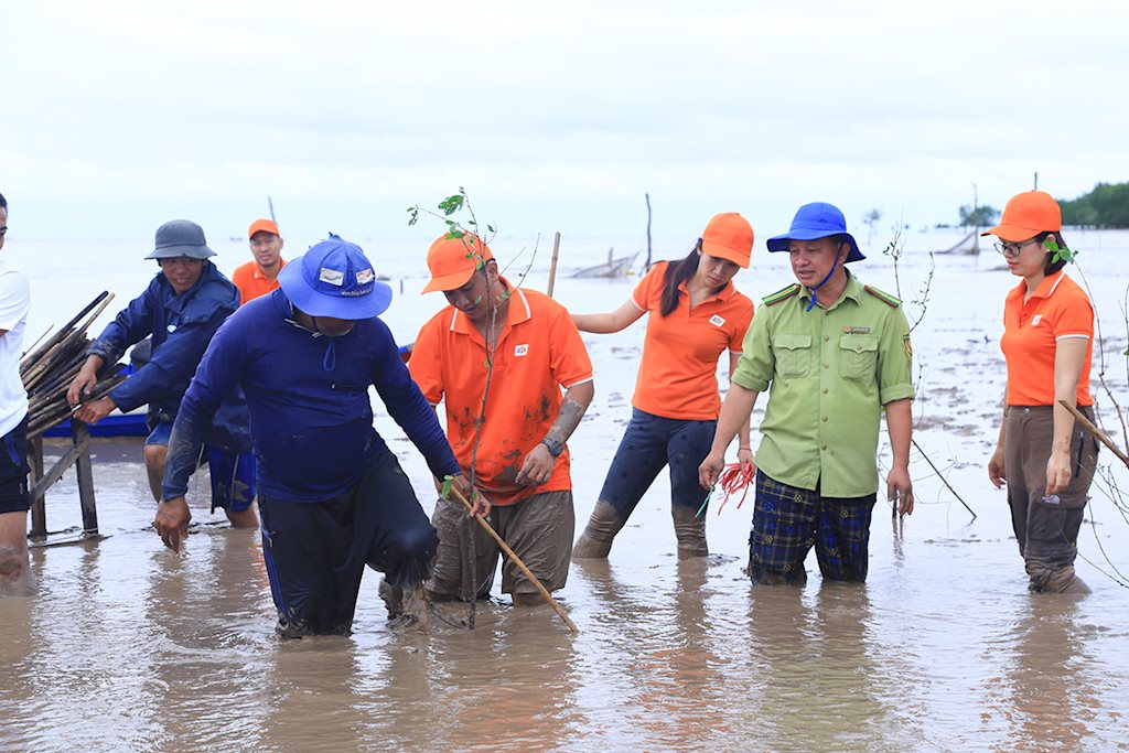 Để trồng được 2.000 cây bần ở khu vực cửa biển, các thành viên trong đoàn đã phải chờ đợi hơn 1 giờ đồng hồ để nước triều rút và lội trong sình lầy trồng cây trước khi kết thúc chương trình vào lúc 12h trưa, để kịp tránh nước lên.