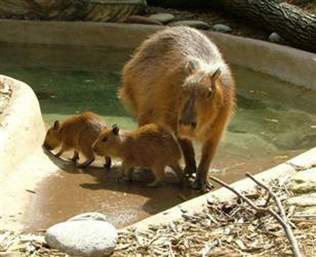 Những con thú đặc biệt này được gọi là chuột lợn nước (capybara, tên khoa học là Hydrochaeris hydrochaeris) thuộc loài gặm nhấm lớn nhất, chiều dài từ 115 đến 130 cm, nặng trên dưới 50 kg. Chúng vừa sông trên cạn vừa sống dưới nước gần những sông ngòi, hồ ao…ở Nam Mỹ. Chuột lợn nước mẹ sinh ra 5 con tai Vườn thú Akron (Mỹ) ngày 24 tháng ba. Không may 3 con chết trong khi đẻ, một con chết khi phải “phẫu thuật thẩm mỹ” vì mông bị lệch. Lũ chuột lợn nước con nói chung khi ra đời có tỷ lệ tử vong rất cao.