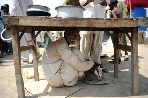 Một người đàn ông Pakistan tại trại tị nạn Sukkur đang trú dưới gầm bàn tránh cái nắng 41¬¬¬oC trong khi chờ được phân phát thực phẩm nhân dịp lễ hội Eid vào ngày 12/9/2010. 19 quốc gia trên trái đất đã có những tuyên bố không chính thức rằng năm 2010 là năm nóng kỉ lục trong lịch sử.