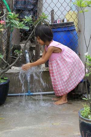 | Bé Thảo vui mừng với hệ thống ống dẫn nước và đồng hồ nước do Coca-Cola và CEFACOM thực hiện tai quận Thủ Đức năm 2011 |