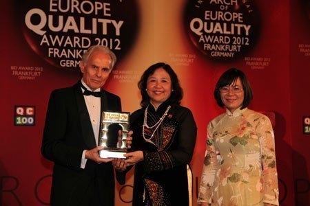| Bà Vũ Thị Thuận, Chủ tịch HĐQT Traphaco vinh dự nhận giải thưởng "Chất lượng quốc tế năm 2012" tại Frankfurt (Cộng hòa Liên bang Đức). |