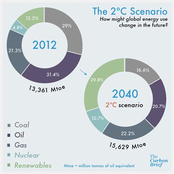 Để nhiệt độ Trái Đất không tăng quá mức 2 độ C vào 2040, nhân loại sẽ phải giảm đáng kể sự lệ thuộc vào nguồn năng lượng hoá thạch (than, dầu và khí đốt)