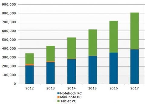 NPD dự báo số lượng máy tính bảng xuất ra sẽ có mức tăng trưởng hàng năm là 28% trong vòng 5 năm tới với 121 triệu trong năm 2012 lên 416 triệu trong năm 2017. Trong lúc đó, số lượng notebook xuất xưởng sẽ tăng từ 208 triệu chiếc năm 2012 lên 393 triệu chiếc năm 2017.