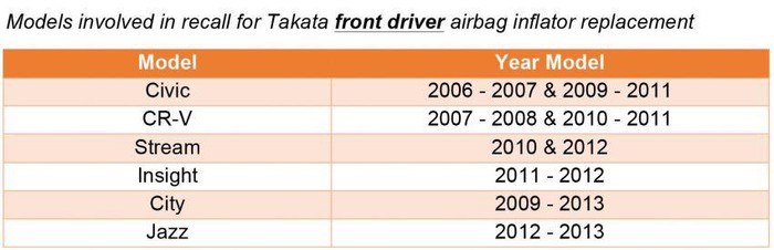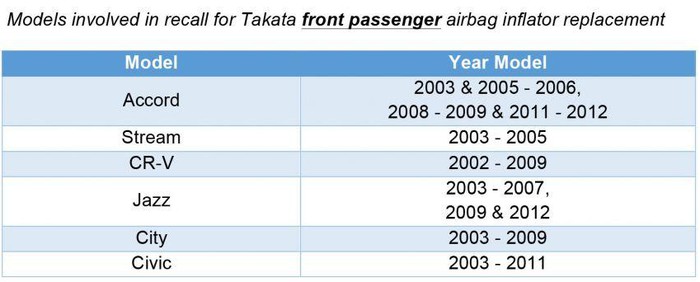 Honda Malaysia vừa công bố một đợt thu hồi khác đối với 23.476 chiếc Accord, City, Civic, CR-V, Insight, Jazz và Stream đã bị thu hồi trước đây, để thay thế cụm bơm hơi túi khí phía trước Takata có khả năng bị lỗi.