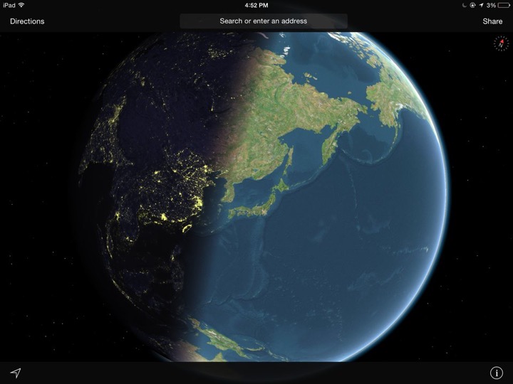 Nếu chọn chế độ xem vệ tinh (satellite) trong Apple Maps và zoom ra hết cỡ, bạn sẽ xem được ánh sáng mặt trời đang chiếu vào đâu trên Trái Đất theo thời gian thực.