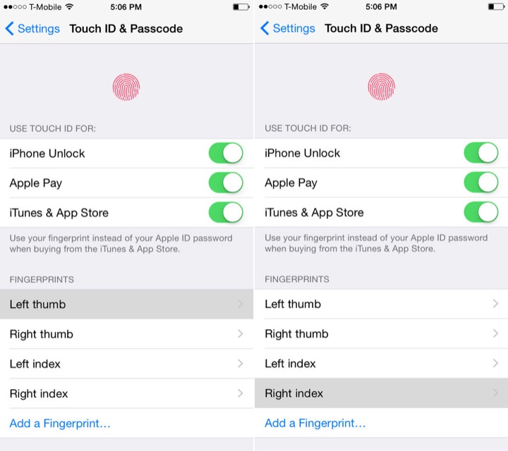 Nếu cần xóa hoặc thêm dấu vân tay, bạn có thể biết được vân tay nào của mình đã được thêm khi đặt ngón tay lên nút Home trong phần quản lý, vân tay đó sẽ được làm nổi lên.