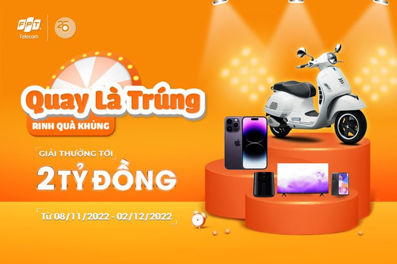 Nhân dịp kỷ niệm 25 năm thành lập, FPT Telecom ra mắt chương trình đặc biệt tri ân khách hàng mang tên "Quay là trúng - Rinh quà khủng" với tổng giá trị giải thưởng lên tới 2 tỷ đồng. Chương trình diễn ra từ ngày 08/11/2022 - 02/12/2022; áp dụng cho người đăng ký lắp đặt các dịch vụ: Internet Only; Combo Internet - FPT Play; Combo Internet - Camera.