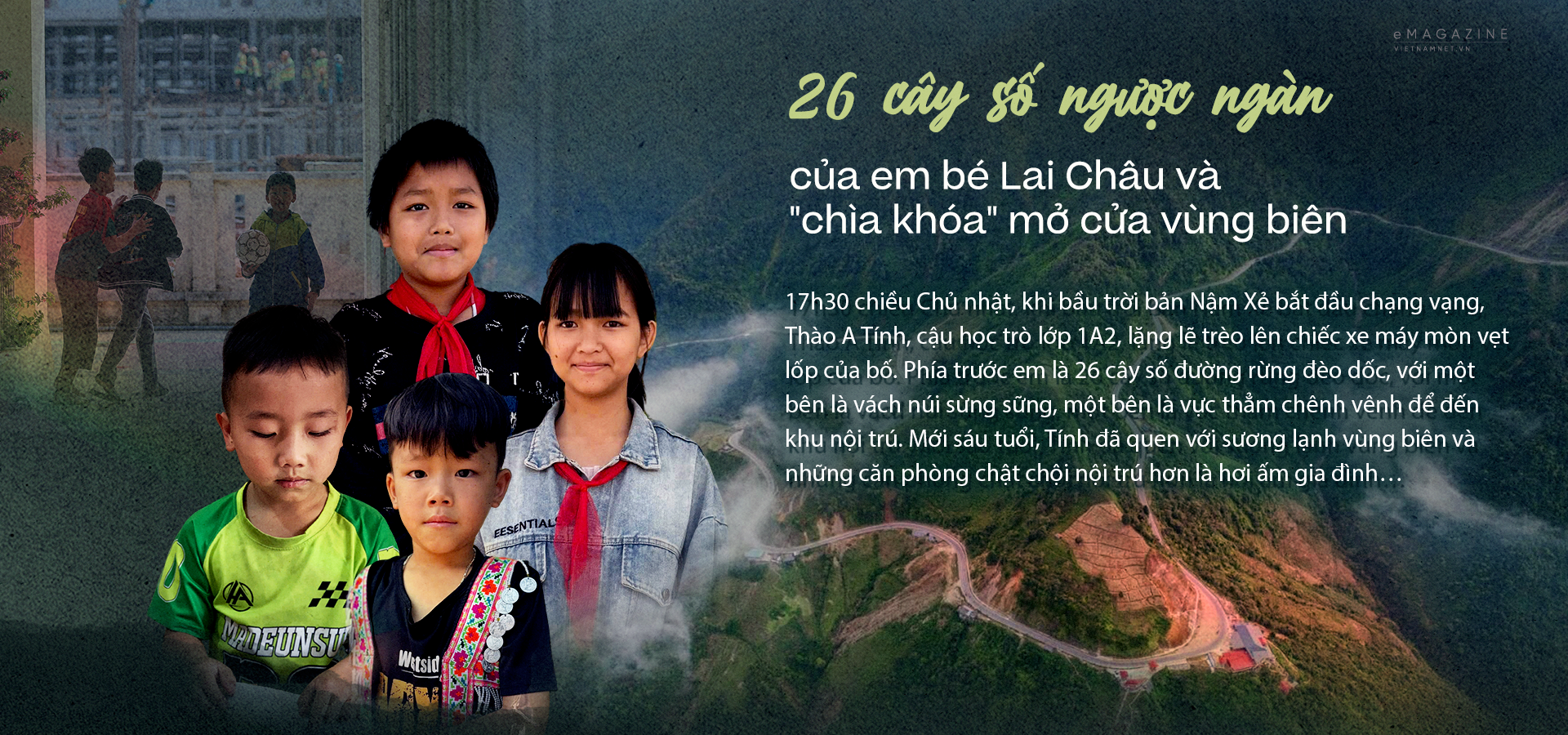 Thào A Tính (ngoài cùng bên trái) và các em học sinh Lai Châu phải vượt quãng đường hàng chục cây số đường núi để đến trường.