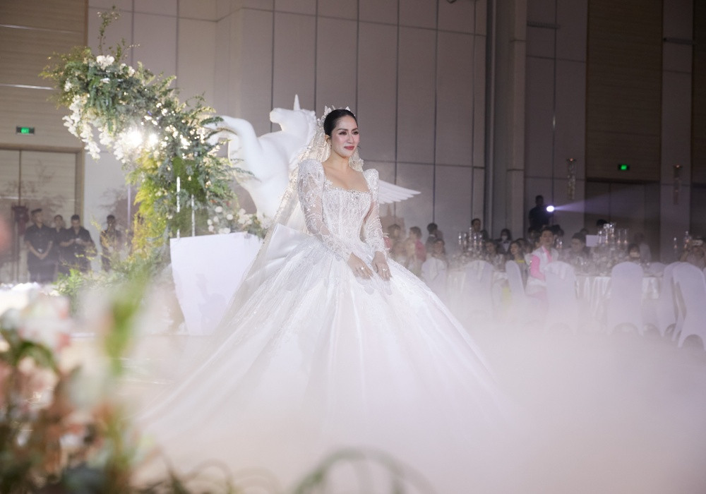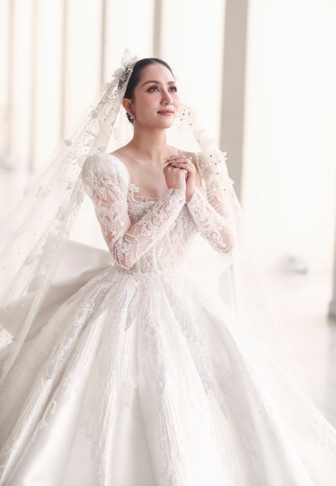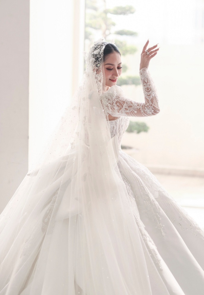 Lễ phục chính của Khánh Thi là mẫu váy mang hơi hướng hoàng gia cổ điển chất liệu ren Pháp.