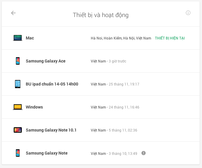 Bước 2: Tại đây bạn sẽ nhìn thấy tất cả các thiết bị, điện thoại hoặc máy tính đang sử dụng bằng tài khoản của bạn trong vòng 4 tuần trở lai, thời điểm chính xác được sử dụng lần cuối hiện ngay trên màn hình cũng như các thông tin khác về những thiết bị đang đăng nhập trong thời điểm hiện tại.