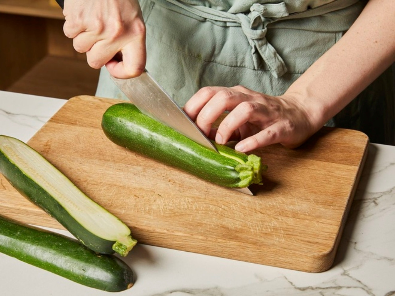 Cắt đôi bí ngòi và cà tím theo chiều dọc.