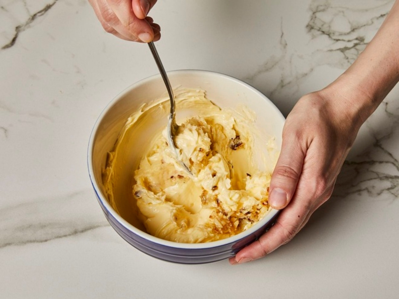 Bóp tép tỏi cẩn thận và trộn chúng với bơ ở nhiệt độ phòng trong bát nhỏ.
