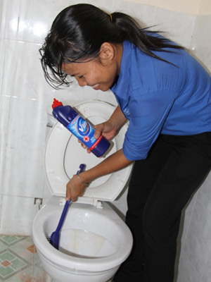 - đang hướng dẫn cách rửa nhà vệ sinh đúng.
