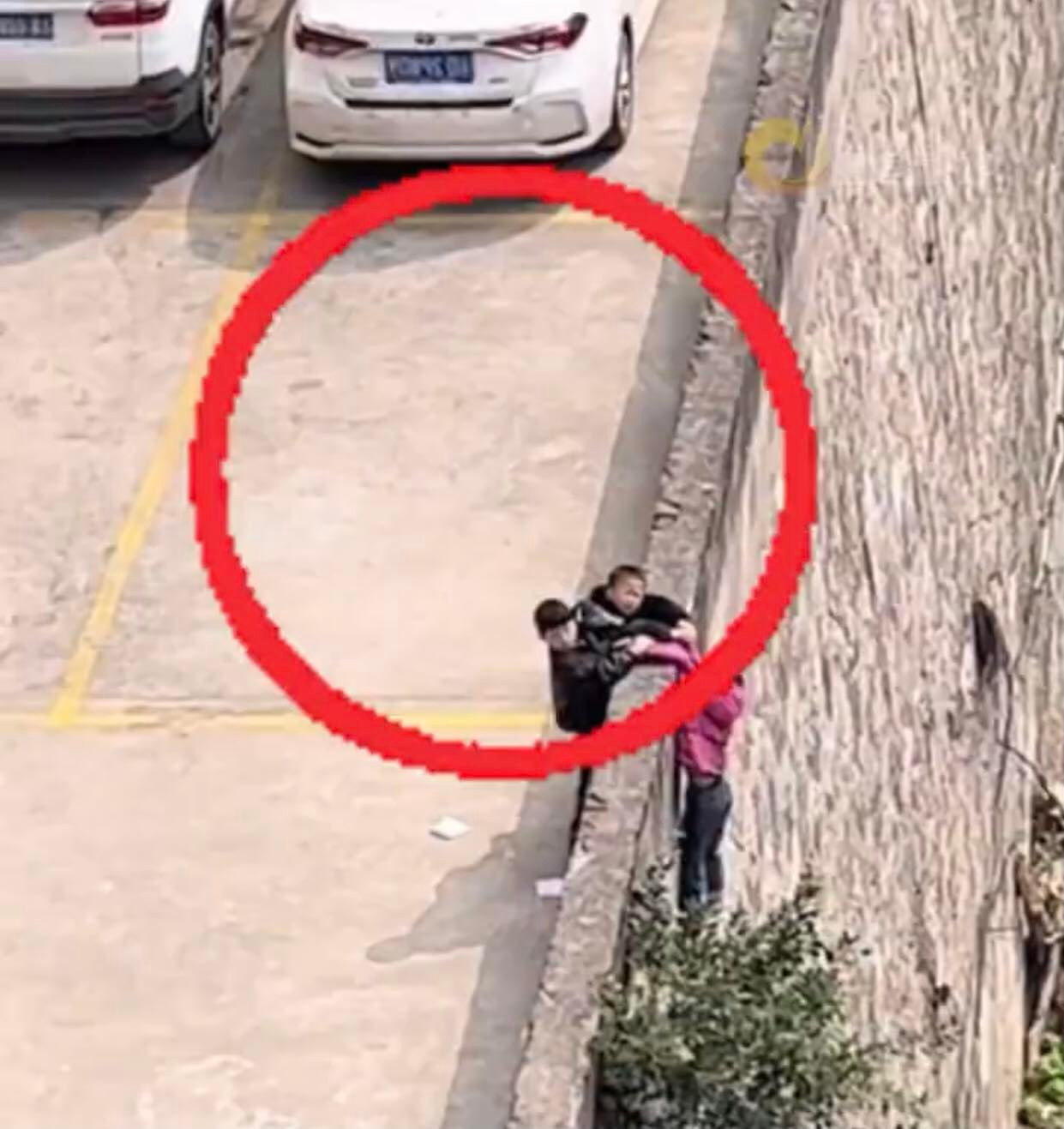 Sau khi bé gái bị trượt chân ngã khỏi bức tường đá chắn ở bãi đỗ xe thành phố Trùng Khánh, tây nam Trung Quốc, 2 cậu bé đã lập tức nắm lấy tay bạn.