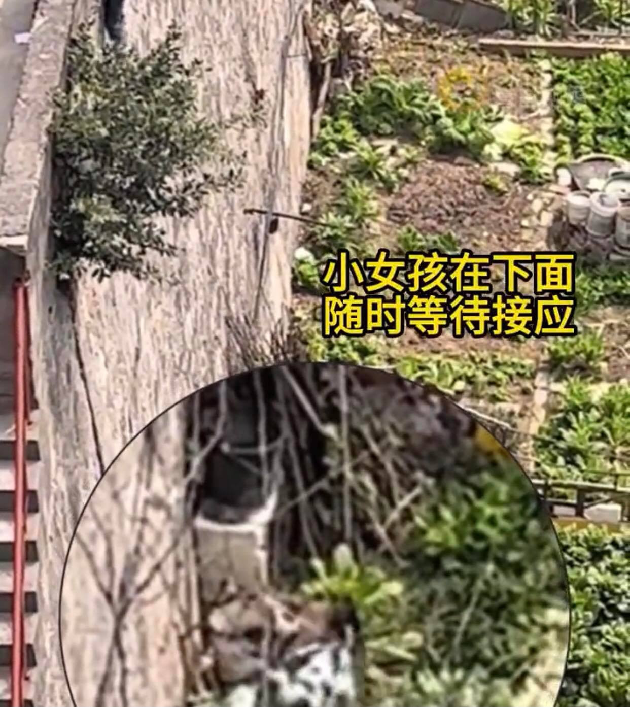 Ngoài 2 bé trai nắm tay bạn ở trên, còn 1 bé gái đứng chờ dưới chân tường để đỡ bạn, đề phòng bạn bị tuột tay, ngã xuống đất. Sau khi cuộc giải cứu thành công, bé gái đứng ở dưới đã chạy lên an ủi, động viên bạn bớt sợ hãi.