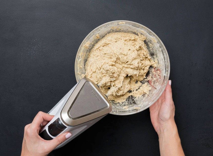 Sử dụng một tô lớn khác, trộn bột mì và hạnh nhân (đã xay), thêm hỗn hợp bơ trứng (đã làm ở bước 1) vào mỗi lần một ít để tạo thành khối bột mịn.