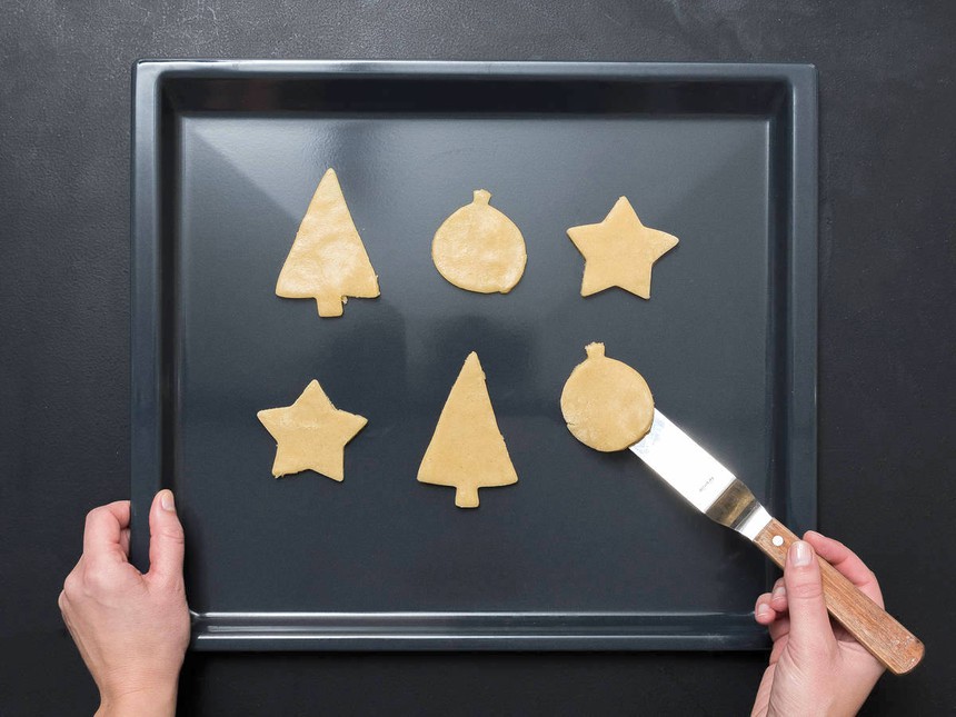 Dùng khuôn (nhiều hình) cắt bột bánh, rồi chuyển sang khay nướng và nướng trong khoảng 10 phút đến khi bánh ngả màu nâu vàng.