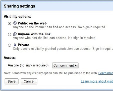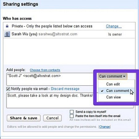 Google cho người dùng cơ hội chia sẻ tài liệu trên Google Docs, đồng thời phân quyền truy cập cho người được chia sẻ với các lựa chọn: Can edit (có thể chỉnh sửa); Can comment (có thể bình luận) và Can view (có thể xem).
