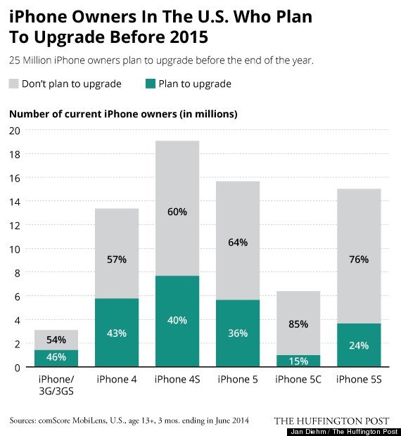 Hàng triệu người dùng iPhone đang nóng lòng được lên đời điện thoại. Theo comScore, hơn 1/3 chủ nhân iPhone tại Mỹ cho biết họ có kế hoạch nâng cấp "dế" trước cuối năm nay. 40% người Mỹ đang dùng iPhone 4s cũng đồng tình. Những người vừa mua iPhone cũng bày tỏ mong muốn mua điện thoại mới: vẫn theo comScore, gần 1/4 người dùng iPhone 5s lên kế hoạch sắm "dế" mới.