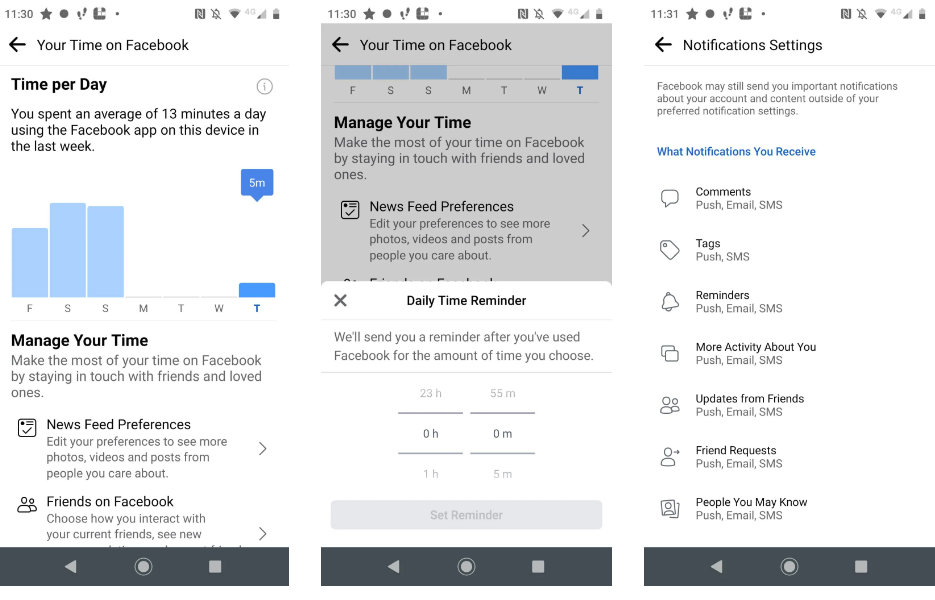 Tại đây, bạn sẽ nhìn thấy đồ thị hiển thị số phút bạn dùng cho ứng dụng Facebook mỗi ngày cùng như hàng tuần. Bấm vào Manage Your Time, Daily Time Reminder mở ra và bạn tự chọn sau bao nhiêu lâu có thông báo nhắc nhở.