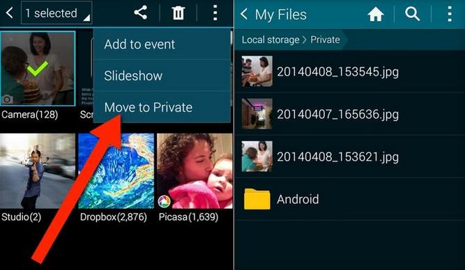Vì một số lý do, bạn có thể muốn cất các file đa phương tiện vào một chỗ mà chỉ mình bạn có thể xem. Tính năng Private Mode mới của Galaxy S5 giúp bạn dễ dàng làm được như vậy. Khi bạn bật Private Mode từ menu Settings, bạn có thể chọn những file ảnh, video, tài liệu hoặc file âm thanh muốn cất giấu, nhấn nút menu hình ba dấu chấm, sau đó chọn “Move to Private”.
