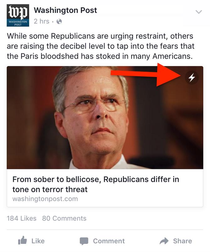 Những bài báo hỗ trợ tính năng đọc báo nhanh Instant Articles đều có biểu tượng hình sấm sét ở góc trên bên phải. Tốc độ tải báo trên Instant Articles nhanh hơn đến 10 lần (theo công bố của Facebook) so với khi xem bằng các liên kết thông thường. Instant Articles được Facebook giới thiệu từ tháng 5, tuy nhiên hiện mới chỉ hỗ trợ cho ứng dụng Facebook trên iPhone.