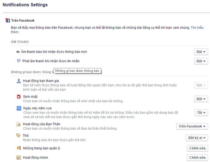 Bạn có thể dễ dàng tùy chỉnh những hoạt động mà Facebook có thể thông báo đến bạn ở phần tùy chỉnhThông báo trong phần thiết lập trên Facebook cho cả máy tính và đi động.