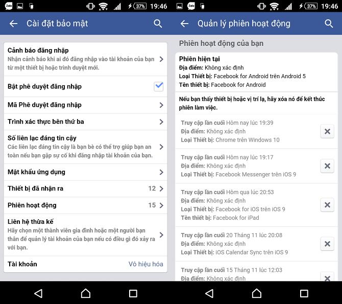 Bạn có thể xem và quản lý những thiết bị đang đăng nhập vào tài khoản Facebook của mình. Từ ứng dụng Facebook trên điện thoại, vào Cài đặt tài khoản -> Bảo mật -> Phiên hoạt động, bạn có thể bấm vào dấu X nếu muốn đăng xuất tài khoản Facebook của bạn ra khỏi một thiết bị nào.