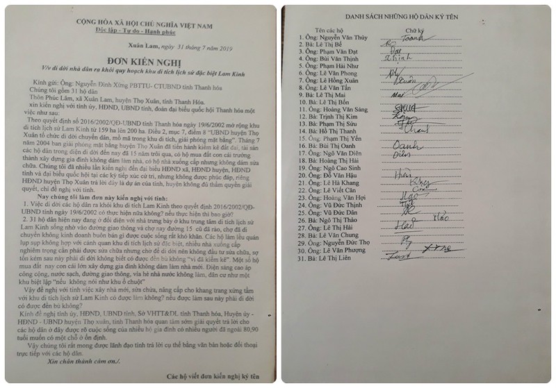 Chính vì vậy ngày 31/7 vừa qua, người dân tại đây lại gửi đơn kiến nghị đến Chủ tịch UBND tỉnh Thanh Hóa về việc có di dời các hộ dân ra khỏi khu di tích như Quyết định năm 2002 hay không?