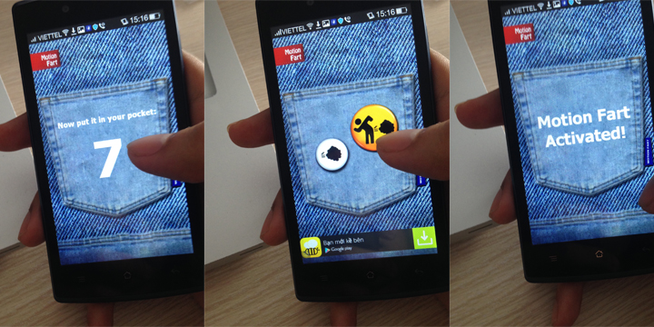 Đương nhiên đây chỉ là "xì hơi" bằng ứng dụng điện thoại. Cũng tương tự như những cách trên hãy lấy điện thoại của hắn rồi down load ứng dụng Motion Fart về, sau đó lén lút vặn hết volume trong điện thoại của hắn lên. Và đừng quên vào setting chỉnh cho sensitivity nhạy lên một tí. Tiếp đến bạn chỉ cần click vào nút màu vàng trên ứng dụng. Khi nạn nhân bỏ điện thoại vào túi thì sẽ không có chuyện gì xảy ra, nhưng chỉ cần hắn di chuyển hoặc cử động thì điện thoại sẽ tạo ra tiếng "xì hơi" rất to. Hơi bất tiện nhỉ?