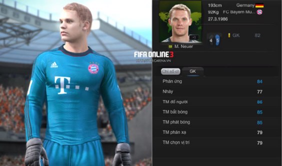 Ngôi sao của tuyển Đức xứng đáng là cầu thủ xuất sắc nhất giải. Hãy xem bộ chỉ số gần như hoàn hảo của anh sau đợt update vừa qua. RM: 84, CAM: 84 và ST: 84. Tương tự như C.Ronaldo, giờ đây Muller là một trong những cầu thủ toàn diện nhất trong FIFA Online 3. Đối với 3 bộ chỉ số nói trên, thấp nhất là các chỉ số rê bóng, vô-lê và sức mạnh: 79(!). Anh có tới 2 chỉ số trên 90: phản ứng và chọn vị trí.